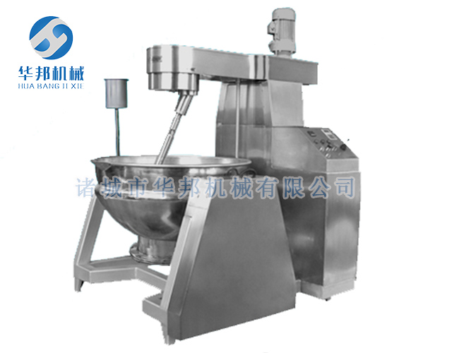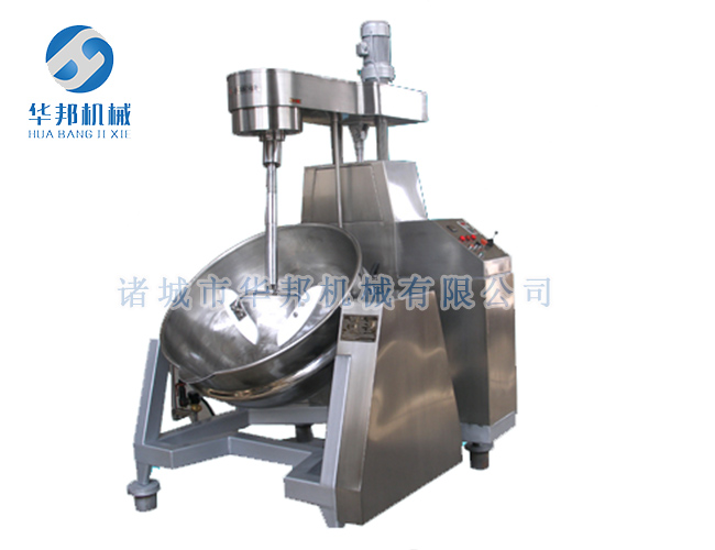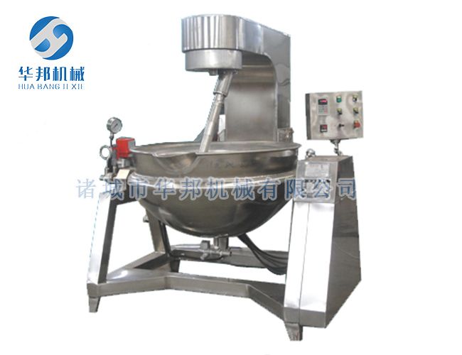 行星攪拌炒鍋 全自動攪拌炒鍋鍋體攪拌部分采用一次性成型的不銹鋼鍋體,保證了鍋內(nèi)的平整光滑。攪拌系統(tǒng)采用自轉(zhuǎn)公轉(zhuǎn)相結(jié)合的方式,其傳動比為不整數(shù)傳動比,保證鍋內(nèi)無任何攪拌盲點(diǎn)。使用先進(jìn)的傳動與密封結(jié)構(gòu),使傳動部分與鍋內(nèi)潔凈、衛(wèi)生。該系列設(shè)備自動/液壓型是利用液壓推力使攪拌臂翻轉(zhuǎn),免拆裝攪拌器,再利用液壓推力傾翻鍋體,易于進(jìn)出原料節(jié)省人力,采用無級變頻調(diào)速器能將高粘度產(chǎn)物混合均勻加熱提高熱量,具有易于操作,工作效率高,耗能低,使用壽命長,結(jié)構(gòu)緊湊,維修方便等特點(diǎn),是性能優(yōu)良的攪拌炒鍋。