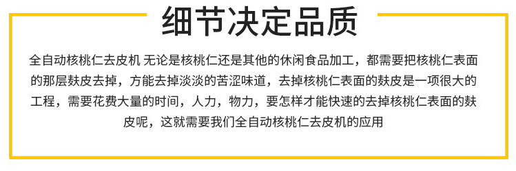核桃深加工時,需要去掉核桃仁外層的薄皮以脫除苦澀味道。以前工藝較為落后,目前諸城華邦機(jī)械的本項創(chuàng)新解決的技術(shù)問題是給廣大核桃產(chǎn)業(yè)提供一種大幅度提高生產(chǎn)效率、節(jié)約用人、純物理脫皮均勻干凈,自動化程度高,不破壞核桃仁內(nèi)在品質(zhì)營養(yǎng)成分,不爛、不碎、不損害外形,果仁完整。