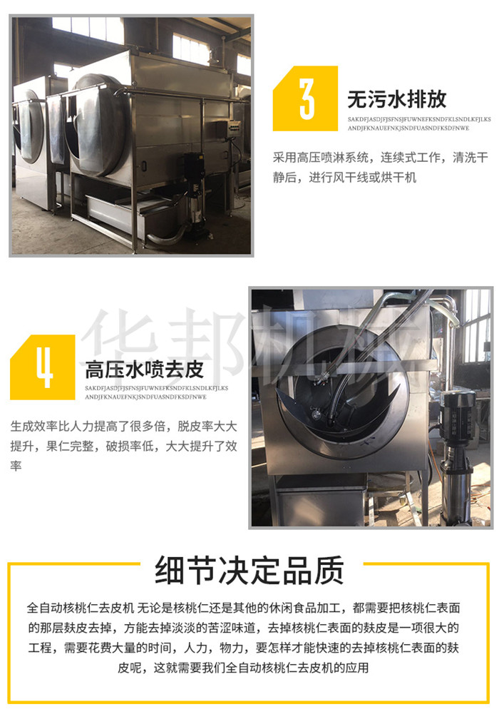 華邦機械純物理核桃仁去皮機(不添加堿,純清水浸泡)采用滾筒連續(xù)式工作,自動連續(xù)式的不間斷的翻滾配合多級高壓泵的作用,可以快速取出清洗掉核桃仁表面的浮皮,使用為了節(jié)約用水的原則循環(huán)利用,高效節(jié)能水資源!