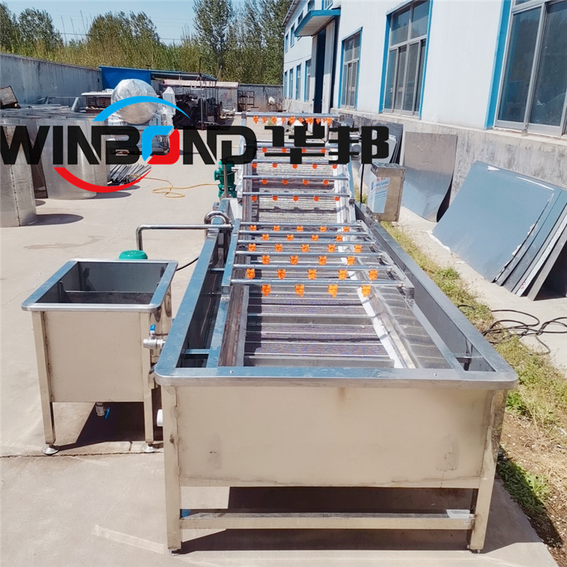 該設(shè)備配有鼓泡、沖浪、噴淋等裝置,可適用于蔬菜水果水產(chǎn)品等顆粒狀、葉類、根莖類產(chǎn)品的清洗。本機(jī)除電機(jī)、風(fēng)機(jī)、循環(huán)泵以外,其他均采用SUS304不銹鋼材料,符合 食品行業(yè)使用標(biāo)準(zhǔn)。本機(jī)采用鼓泡、沖浪、提升處凈水噴淋。一側(cè)有去雜循環(huán)水箱,所有雜物經(jīng)此水箱過濾去雜,其中網(wǎng)帶提升處為凈水噴淋。