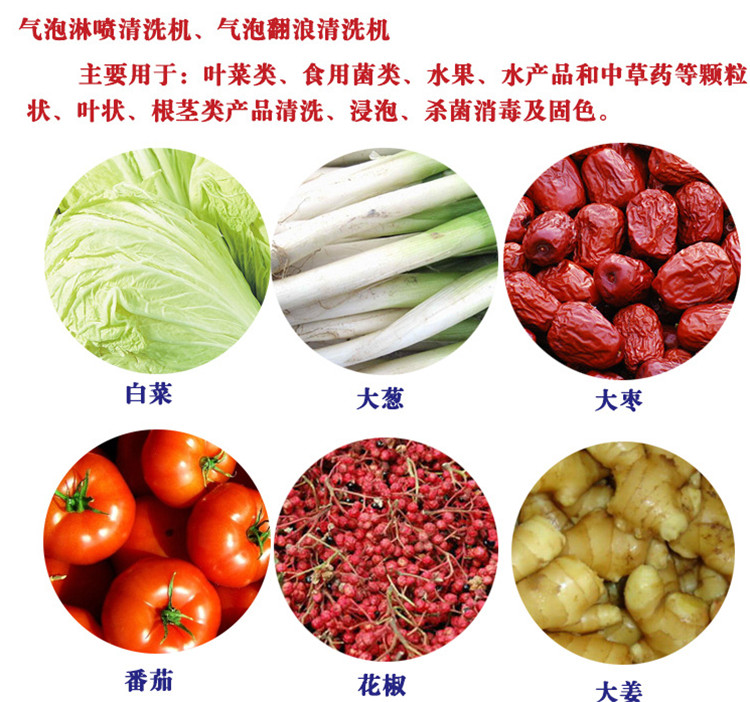 蔬菜,水果、水產(chǎn)品等顆粒狀、葉狀、根莖類產(chǎn)品清洗、浸泡、和對(duì)腌漬品脫鹽等。辣椒、小白菜、蘑菇、菠菜、青菜、包菜、生菜、韭菜、蒜苗、芹菜、龍須菜、苘蒿、山蟄菜、空心菜、木耳、銀耳、地耳、石耳、平菇、草菇、金針菇、茶樹菇、裙帶菜等
