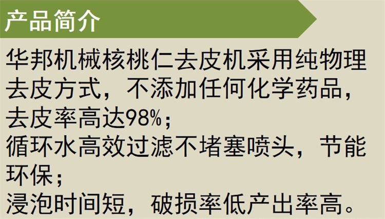 華邦機(jī)械十年的制造經(jīng)驗(yàn),根據(jù)多年來(lái)的研發(fā),試機(jī),客戶的要求進(jìn)行不斷的完善!最終研發(fā)出了第五代核桃仁去皮機(jī) ,自動(dòng)進(jìn)料。加大產(chǎn)量,縮短去皮的時(shí)間,更容易的將核桃仁皮完全去除!