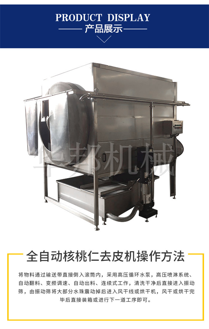 核桃仁的制作流程一般來說新鮮的核桃去掉青皮之后,再去掉硬殼,用水泡一下種仁,把種仁表面的一次淡黃色的內(nèi)種皮去掉,得到的白色種仁再吃就沒有什么澀味了。不去內(nèi)種皮的話,吃起來肯定會比較苦澀,影響口感。華邦機械新款核桃仁去皮機,采用滾筒式去皮,滾筒占地面積小,但是工作效率高,產(chǎn)量大。采用高壓噴淋清洗,能360度的將核桃仁的凹凸表皮去掉。直接采用自來水等清水去皮,不加藥水,色澤好,口感佳。脫皮時間短,12分鐘左右就可以完全脫掉,0破損,果仁完整。脫皮后的水可以直接排放,0污染