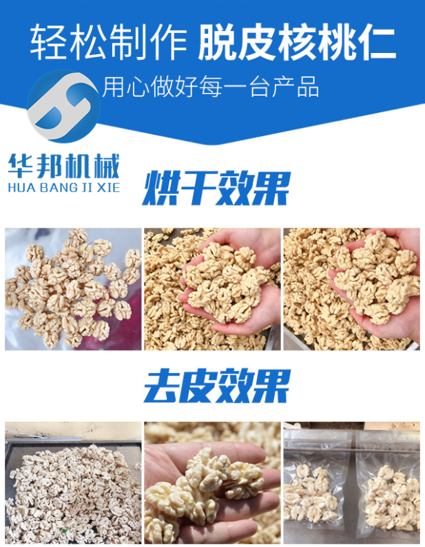 華邦核桃仁去皮機,專門針對核桃仁發(fā)苦發(fā)澀薄皮去除,去皮率高達98以上,并且果仁完整,設備采用滾筒設計,占地面積小,產(chǎn)量大,小型去皮機60kg/小時,中型去皮機100kg/小時,大型200kg/小時。型號齊全,支持加工定制,滾筒式設計,大大減小了核桃仁的破損率。